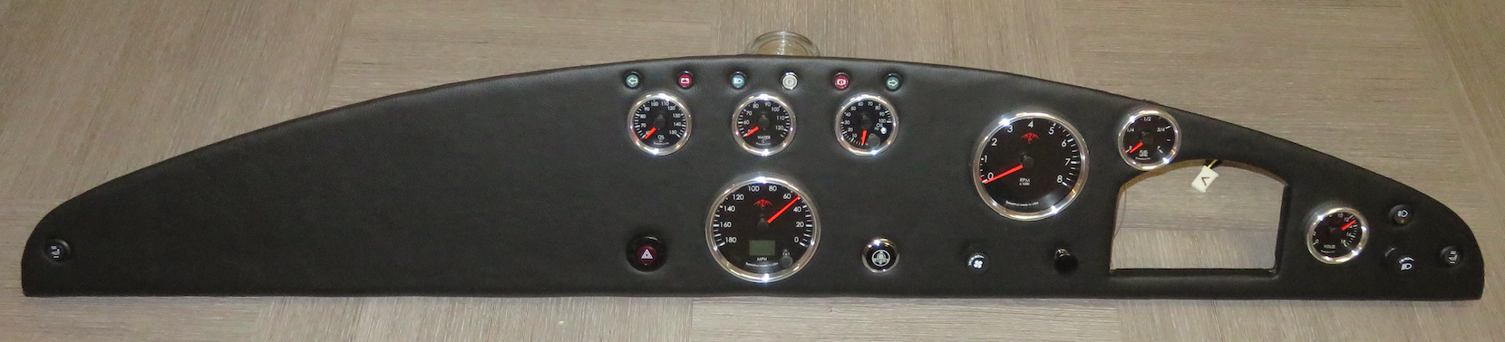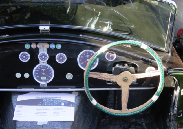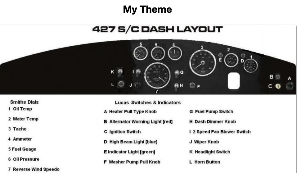 My dashboard design is along the lines of the classic 427 S/C configuration. However, my Euro has the [supplied] Vauxhall steering column, replete with stalks that do what stalks do, and a huge shiny shroud. I've slimmed down what actually goes on the dash and moved a couple of things around a bit.