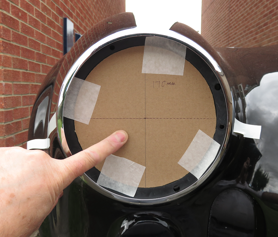 The first thing was to measure where to cut the holes. The 170 mm diameter for the headlights had been scribed, but taking heed from other builders' experiences with factory markings, I too took the path of righteousness and re-verified where the centre should be. To do this, I called on my dormant "O" level geometry skills and made a circular template. Then I had to work out where the exact centre of the circle would be... So far so good...!!!