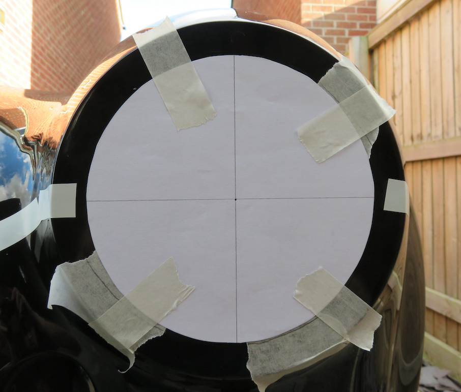The outer edge of the body, where the rim sits, was a bugger to determine as it rounded away from the eye, so the edge was not easy to define. Also, the rubber gasket was flopping around like a wet-wellie-in-a-thunderstorm, and any attempt at accurate positioning by sticking it on with masking tape was pointless. The 170 mm circular template cured this by firming and rounding things up. I also found the template of the gasket helpful, too. Taped the rubber gasket to the inner template and lined it up as best I could with my Mk1 eyeball... Looking good