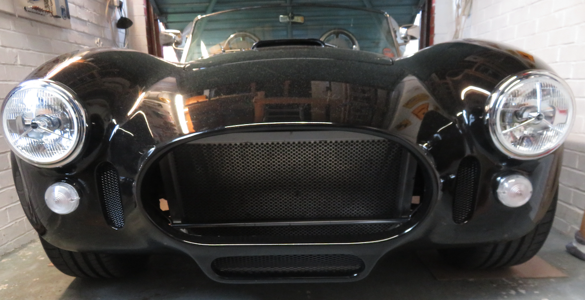 Front light holes all cut out, lights in and then, as if by divine intervention, the car got christened by a heavy shower; and I was quite pleased with the shine and the beading of the wax on the GRP.