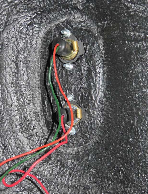 Drilled the holes to the specified diameter and... Problem. The light fitting would not go into the hole, so I whittled away with a circular file until it did. However, once in, it didn't sit flat against the body; it sort of wobbled back and forth like a see-saw. This was because the flat chrome light housing was not perfectly flat around the centre where the bulb holder was crimped in place. I checked the others, and they were all similarly a little distorted. And with this, I concluded that the manufacturing process, where the bulb holder and female 'gnd' terminal had been crimped in place, was the cause of the distortion. File time again, and I enlarge the hole by a couple of mms to allow for the distortion. Problem solved... Not happy but progressing nicely.