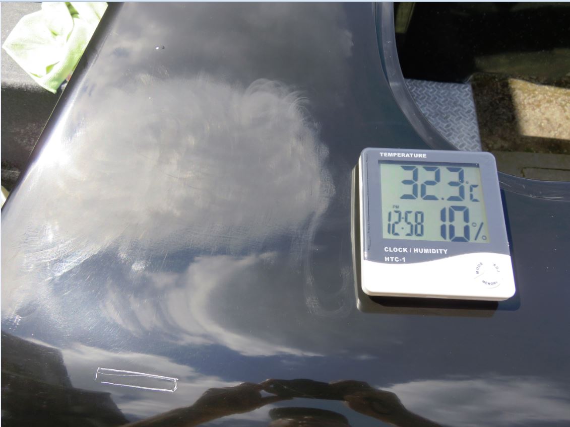 Retrospectively, it appears I did everything right, but at the wrong time of year. He suggested when flatting in winter, the garage will need to be at least 15 degrees, and he recommended I also slightly warm up the gelcoat with a hairdryer or heat gun... Not my first course of action Kemosabe. But as this is all new to me, and to minimise the risk, but to try to recreate the conditions, I compromised and waited for a lovely spring day (May) and let the car sit in direct sunlight to warm up. I also used warm water as the lubricant. Conditions were 18 degrees in the shade and about 30-33 degrees in direct sunlight.
